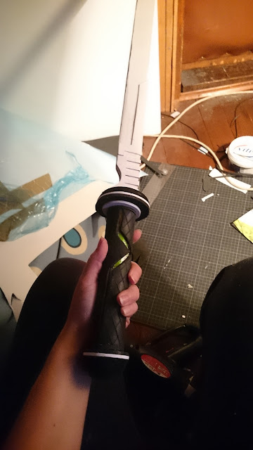 the blade of the sword is 3 part sintra/forex, with the middle layer hollowed out and filled with wooden sticks, since sintra itself is quite bendable and not really stiff, so it wobbles..a lot |